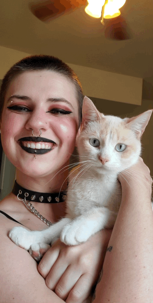 Carmen is a special needs kitty with Cerebellar Hypoplasia and suffered from giardia and a herpes flare as a kitten. She is now healthy, full of life, and runs the household even though she is years younger than her 3 cat siblings. Carmen enjoys “bunny hopping” around the house, chasing after her dad, and playing with her favorite toy - a stuffed pickle.