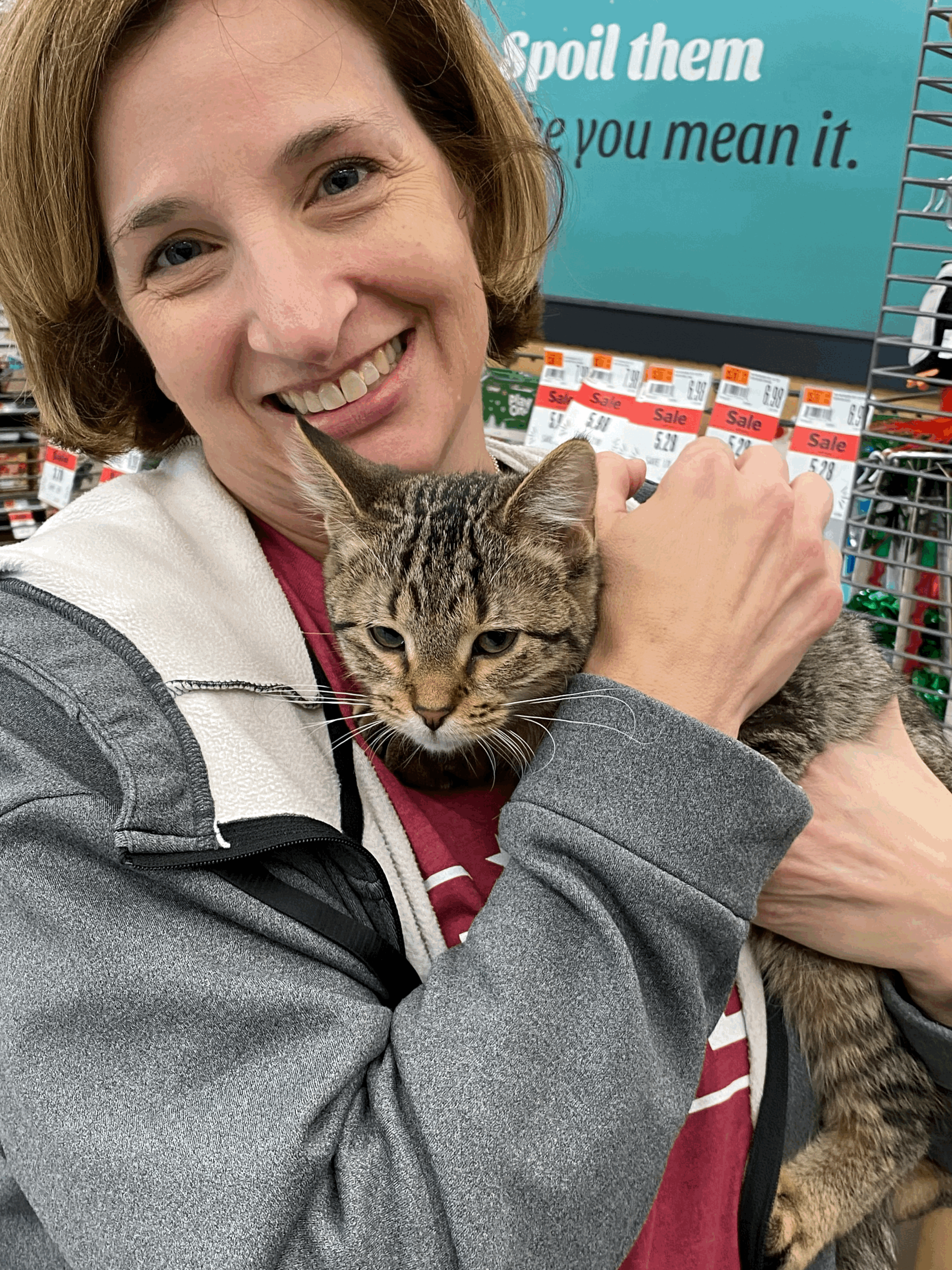 Salem came to Whiskers as a mom of 6 newborn kittens. She had traveled 5 hours to us and was absolutely scared to death. Salem was so nervous that her milk had dried up and a volunteer needed to step in and bottle-feed her babies. Slowly over 5 months she learned to trust humans and became brave enough to walk around a room without hiding. When Sarah came along we talked about Salem’s needs and Sarah was up to the task! Salem settled into her new home and within a week was fully adjusted to her new home. Sometimes all a kitty needs is a person like Sarah in their life.